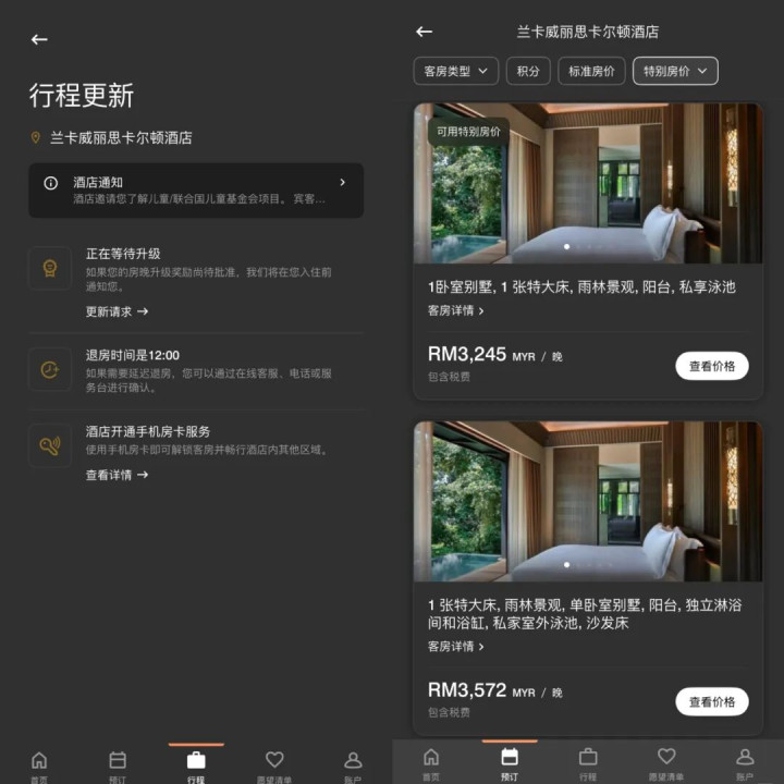 迈克去马来西亚兰卡威游玩时,为了凑房晚保级万豪白金会员,选了当地的丽思卡尔顿酒店,并在万豪App上使用了升房券,打算升级成Villa房型。